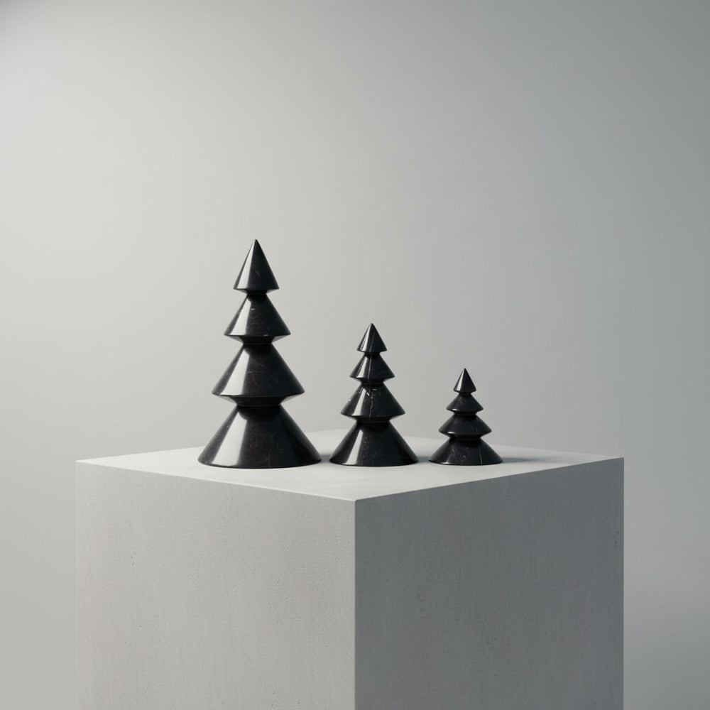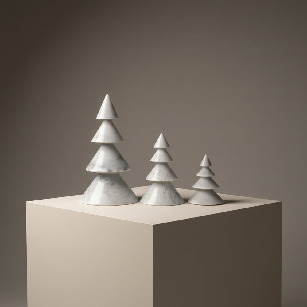Una colección creada para elevar la temporada navideña con la belleza atemporal del mármol natural. Cada pino es tallado individualmente, conservando las vetas y tonalidades únicas de la piedra, lo que hace que cada pieza sea irrepetible.